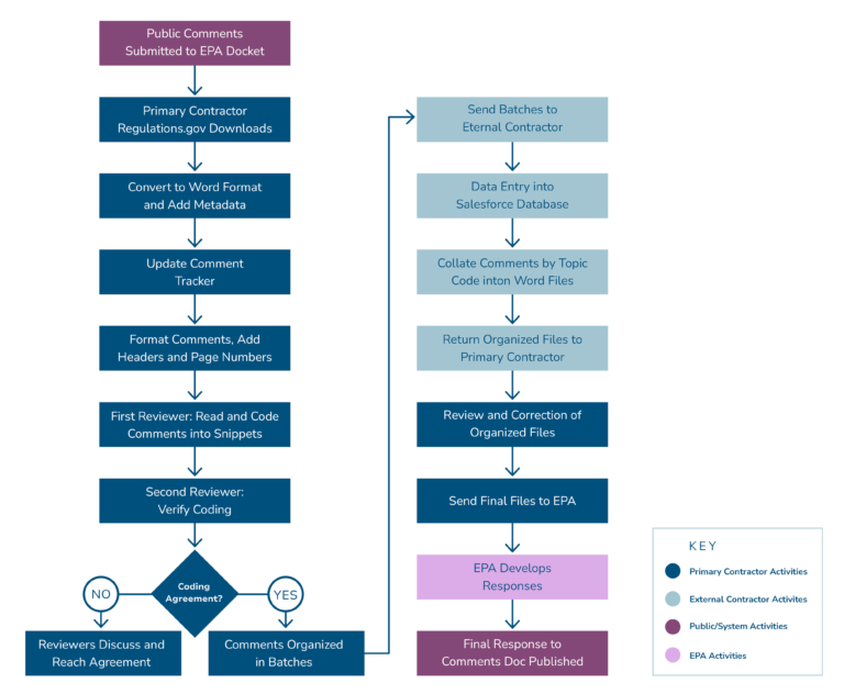 The existing public comment processing system follows a structured workflow beginning with comment submission to the EPA dockets and concluding with published response documents (see Figure 1). Comments are downloaded from regulations.gov, converted to standardized formats, categorized by topic codes, and organized for EPA technical review. Multiple quality assurance steps ensure accurate categorization and comprehensive coverage.
