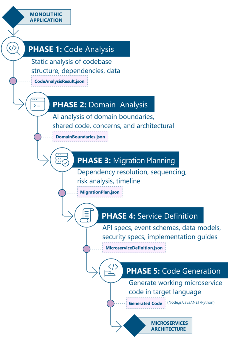 A transformation of this scale should be guided by data and patterns, not just by intuition. Each phase produces structured, machine-readable output that feeds the next phase and that can also be inspected and refined by humans.