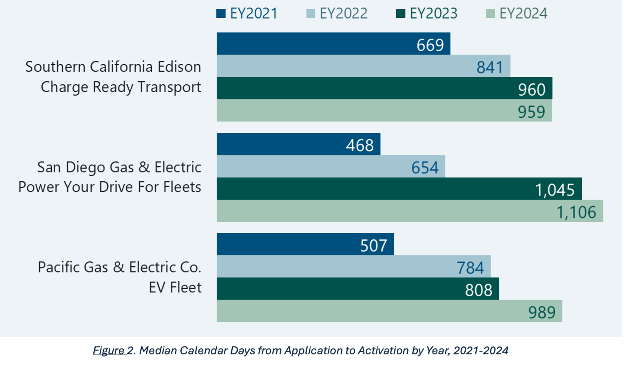 We found projects are also taking much longer to complete year over year (Figure 2). Across all utility MDHD programs, sites had a median start-to-finish timeline of 600 days in 2021, 725 days in 2022, 862 days in 2023 and 983 days in 2024. It is important to note that larger, more complex sites have longer activation timelines all else equal and this trend of growing site development durations could be due to the utilities activating larger sites in later years.
